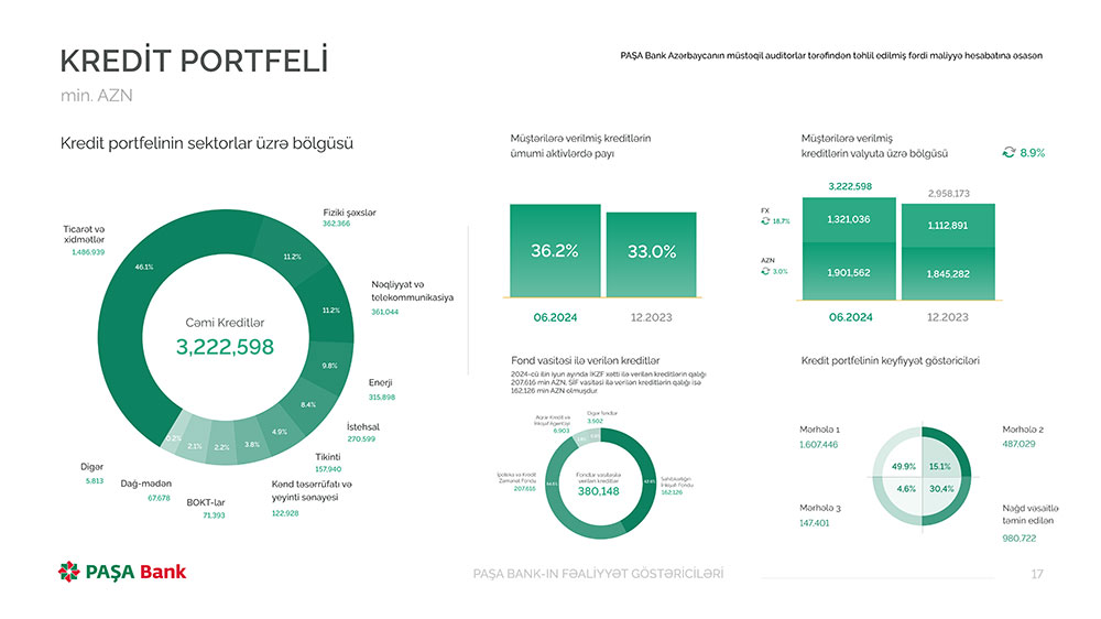 Marja xəbər verir ki, dünən keçirilmiş mətbuat konfransında "PAŞA Bank" ASC-nin İdarə Heyətinin üzvü, Baş Maliyyə inzibatçısı Murad Süleymanov bildirib ki, 2023-cü ilin sonu ilə müqayisədə 2024-cü ilin birinci yarısında Bankın cəmi kredit portfeli 264 milyon 425 min manat və ya 8,9% artaraq 3 milyard 222 milyon 598 min manata çatıb. O cümlədən, xarici valyutada verilən kreditlər 208 milyon 145 min manat və ya 18,7% artaraq 1 milyard 321 milyon 36 min manata, milli valyutada verilən kreditlər 56 milyon 280 min manat və ya 3% artaraq 1 milyard 901 milyon 562 min manata çatıb.