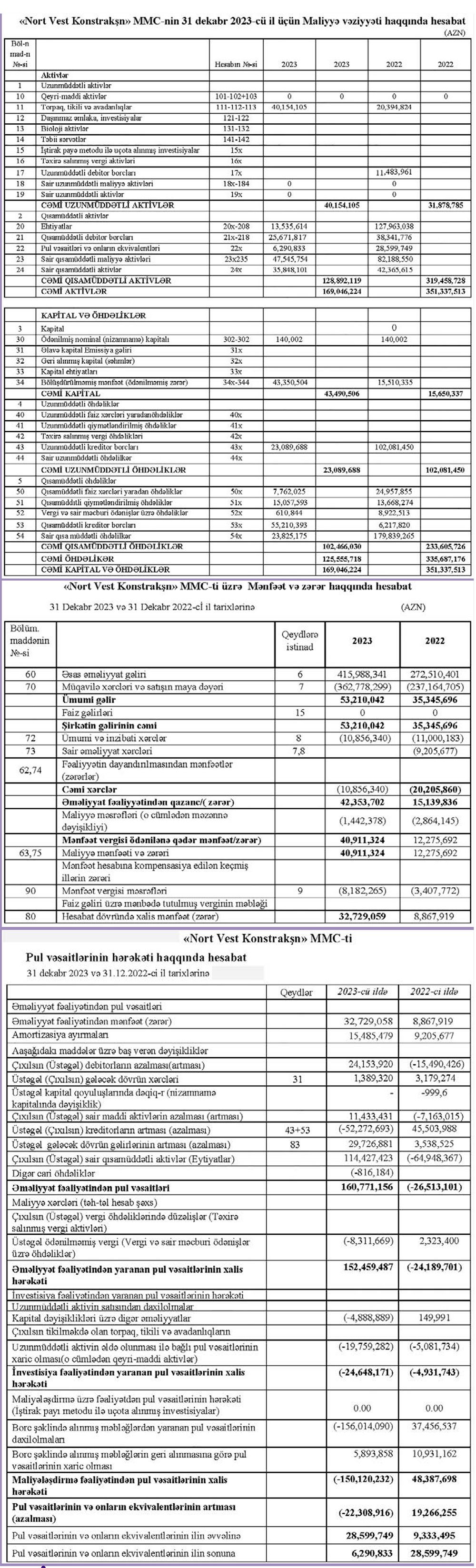 "Nort Vest Konstrakşn" MMC 2023-cü ili 32 milyon 729 min manat xalis mənfəət ilə başa vurub. Şirkət 2022-ci ili 8 milyon 868 min manat xalis mənfəət ilə bağlamışdı. Beləliklə, 2022-ci illə müqayisədə 2023-cü ildə "Nort Vest Konstrakşn" şirkətinin xalis mənfəət 3,7 dəfə artıb. Xalis mənfəətin artması gəlirin artmasından qaynaqlanıb.