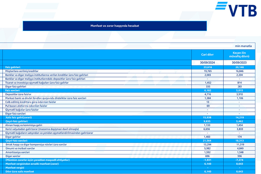 "Bank VTB (Azərbaycan)" ASC 2024-cü ilin 9 ayını (yanvar-sentyabr) 6 milyon 140 min manat xalis mənfəət ilə başa vurub. Bank 2023-cü ilin eyni dövrünü 8 milyon 643 min manat xalis mənfəət ilə bağlamışdı. Xalis mənfəətin 2 milyon 503 min manat və ya 29% düşməsi Bankın cari fəaliyyətindən deyil, mümkün zərərlər üçün yaradılan ehtiyatdan azad olan vəsaitin azalması ilə əlaqədardır.