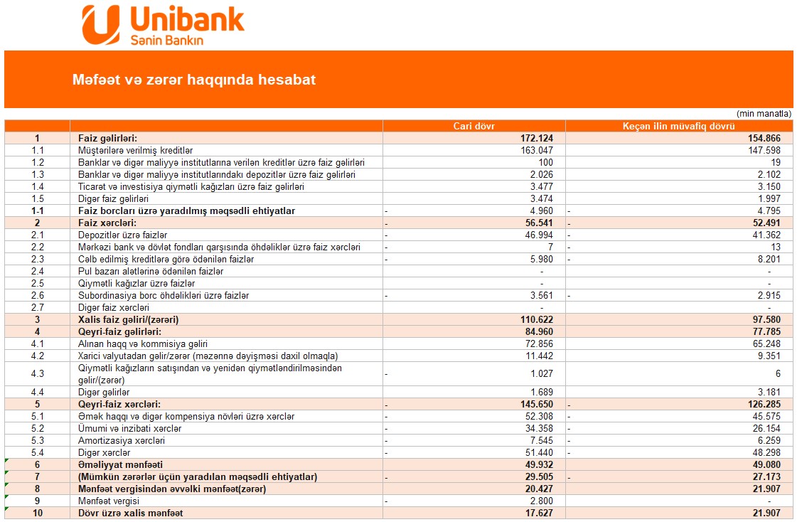 "Unibank Kommersiya Bankı" ASC 2024-cü ilin 9 ayını (yanvar-sentyabr) 17 milyon 627 min manat xalis mənfəət ilə başa vurub. Bank 2023-cü ilin eyni dövrünü 21 milyon 907 min manat xalis mənfəət ilə bağlamışdı.