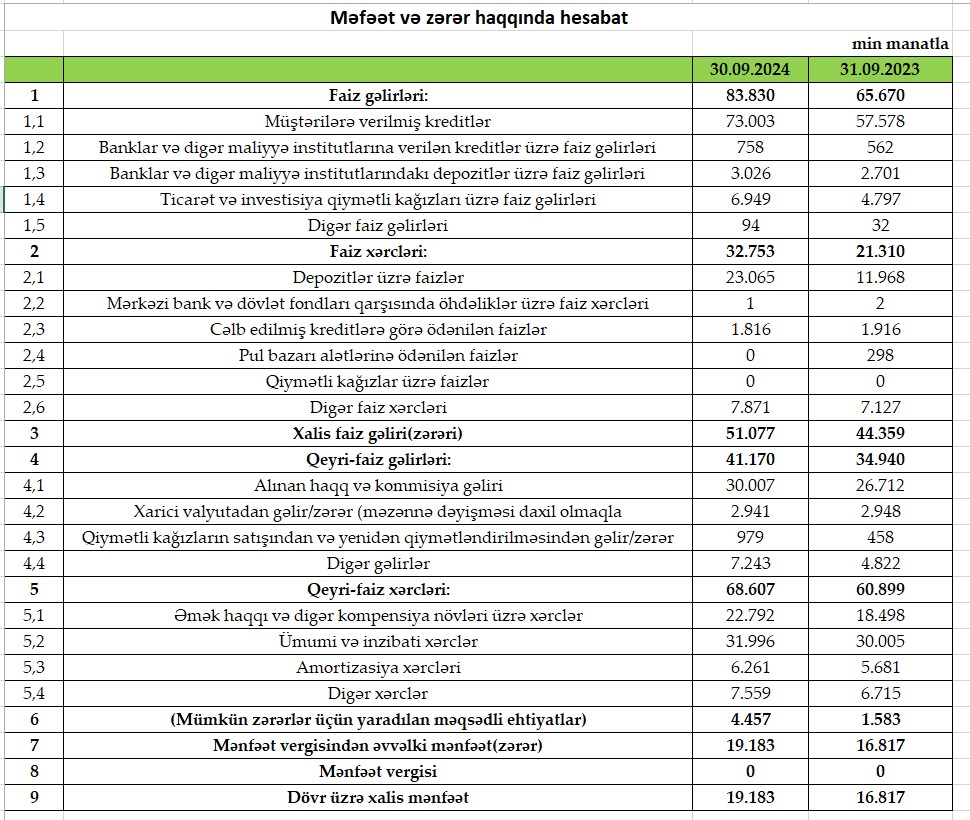 Müqayisə üçün qeyd edək ki, 2023-cü ilin 9 ayı ərzində "Rabitəbank"ın cəmi əməliyyat gəlirləri 100 milyon 610 min manat, cəmi əməliyyat xərcləri 82 milyon 209 min manat, əməliyyat mənfəəti 18 milyon 401 min manat təşkil etmişdi. Bank əməliyyat mənfəətindən 1 milyon 583 min manat mümkün zərərlər üçün yaradılan məqsədli ehtiyatlara ayırmışdı.