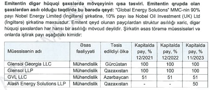 "Global Energy Solutions" MMC-nin nizamnamə kapitalının 90%-i "Nobel Energy Limitet" şirkətinə (İngiltərə) və 10%-i "Nobel Oil İnvestment (UK) LTD" (İngiltərə) şirkətinə məxsusdur.