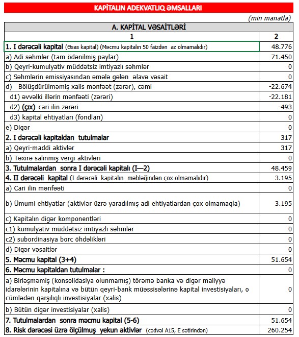 2024-cü ilin 3-cü rübünün sonuna Bankın məcmu kapitalı 51.4 milyon manat təşkil etmişdir, bu da Mərkəzi Bankın minimum tələbindən (50 milyon manat) yüksəkdir. Məcmu kapitalın adekvatlıq göstəricisi 21% təşkil etməklə, Mərkəzi Bankın minimum tələbini (10%) əhəmiyyətli dərəcədə üstələyir. Cari il ərzində Bank “BTB” nizamnamə kapitalını yeni emissiya hesabına 5 milyon manat artırmışdır.