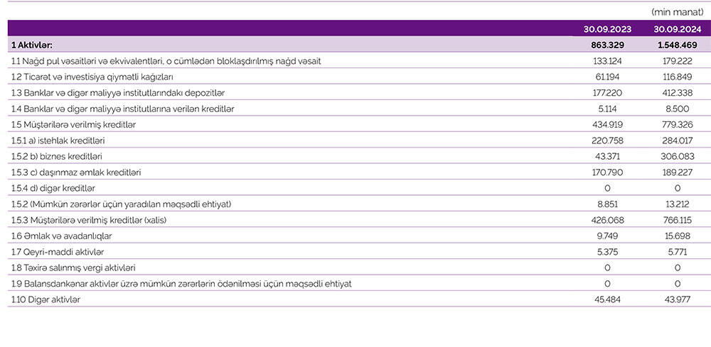 Bankın yaydığı press-relizdə bildirilri ki, Azər Türk Bankın 01 oktyabr 2024-cü il tarixinə aktivləri ötən ilin müvafiq dövrü ilə müqayisədə 80%-dək artaraq 1 milyard 548 milyon manat səviyyəsində olmub.