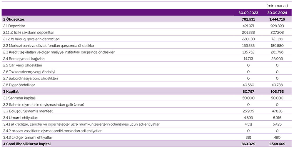 Bankın cəmi öhdəliklərinin həcmi 1,4 milyard manat, o cümlədən depozit portfeli böyüyərək 928,4 milyon manat təşkil edib.