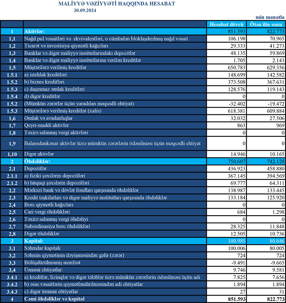 30 sentyabr 2024-cü il tarixində "Turan Bank" ASC 120 milyon 180 min manat məcmu kapitala malik olub.