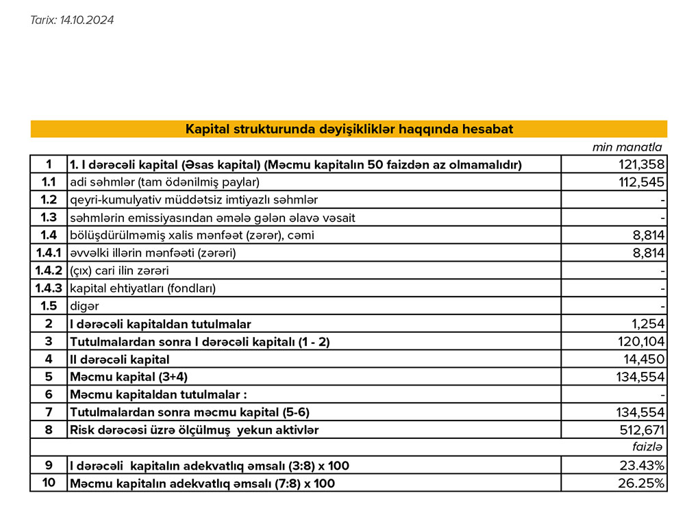 Müqayisə üçün qeyd edək ki, 2023-cü ilin 9 ayı ərzində "Expressbank" 13 milyon 457 min manat əməliyyat mənfəətindən1 milyon 16 min manat mümkün zərərlər üçün yaradılan məqsədli ehtiyatlara ayırmışdı.