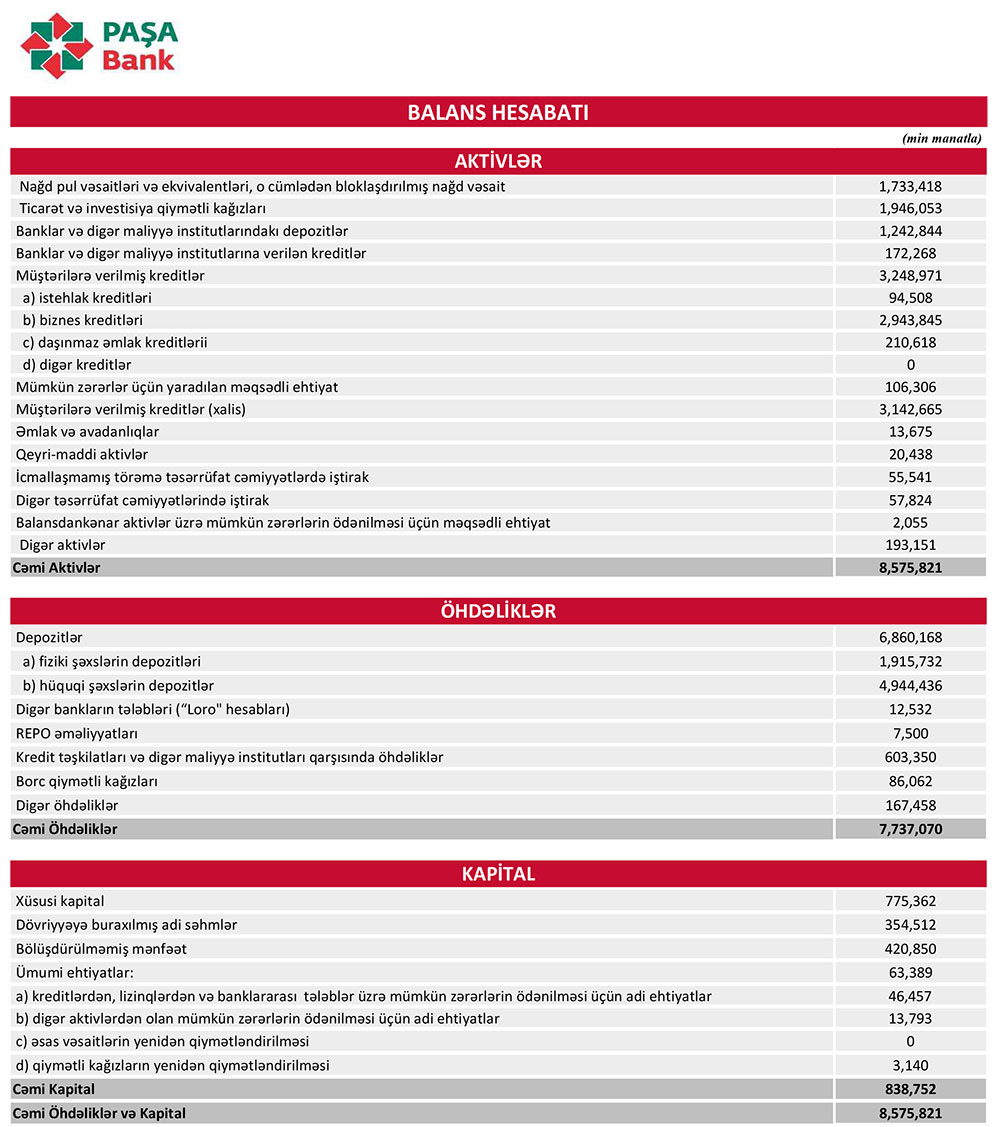 2023-cü ilin sonu ilə müqayisədə 2024-cü ilin 9 ayı ərzində "PAŞA Bankın" cəmi aktivləri 75 milyon 550 min manat azalaraq 8 milyard 575 milyon 821 min manata, Bankda depozitlər isə 75 milyon 7 min manat azalaraq 6 milyard 860 milyon 168 min manata geriləyib. Bankda fiziki şəxslərin depozitləri 281 milyon 802 min manat artıb, hüquqi şəxslərin depozitləri 356 milyon 808 min manat azalıb.