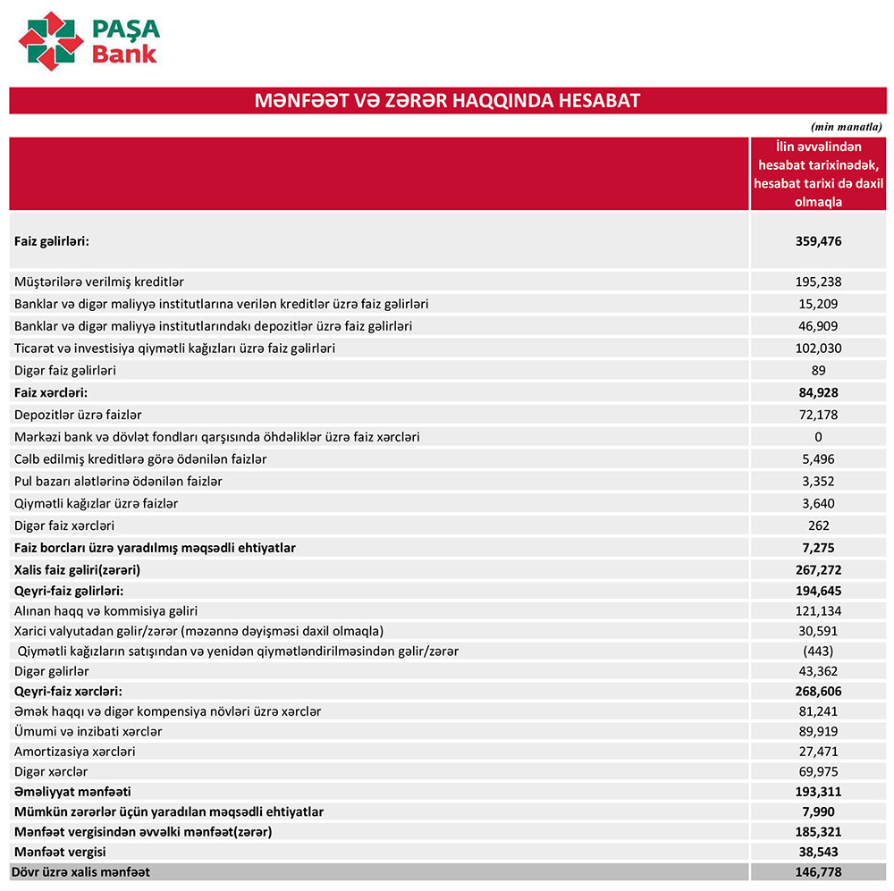 "PAŞA Bank" ASC 2024-cü ilin 9 ayını (yanvar-sentyabr) 146 milyon 778 min manat xalis mənfəət ilə başa vurub. Bank ötən ilin eyni dövrünü 147 milyon 269 min manat xalis mənfəət ilə bağlamışdı. Xalis mənfəətin cüzi azalması əsasən xərclərin gəlirlərdən daha çox artması ilə əlaqədardır.