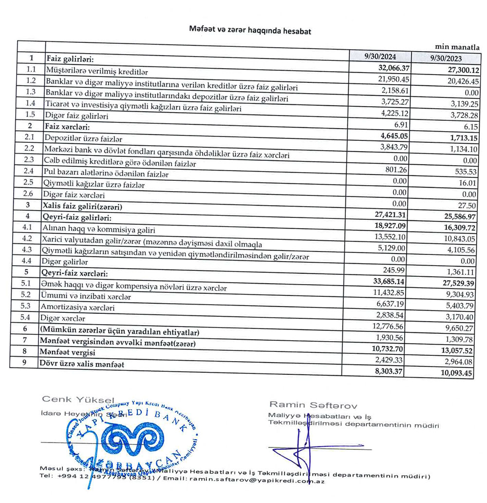 Türkiyə bankının Azərbaycandakı törəməsi "Yapı Kredi Bank Azərbaycan" QSC 2024-cü ilin 9 ayını (yanvar-sentyabr) 8 milyon 303 min manat xalis mənfəət ilə başa vurub. Bank ötən ilin eyni dövrünü 10 milyon 93 min manat xalis mənfəət ilə bağlamışdı. Beləliklə, "Yapı Kredi Bank Azərbaycan"ın xalis mənfəəti 1 milyon 790 min manat və ya 17,7% azalıb. Xalis mənfəətin azalması xərclərin və mümkün zərərlər üçün yaradılan məqsədli ehtiyatlara ayrılan vəsaitin artması ilə əlaqədardır. 2024-cü ildə "Yapı Kredi Bank Azərbaycan" böyüyüb, kredit portfeli artıb.