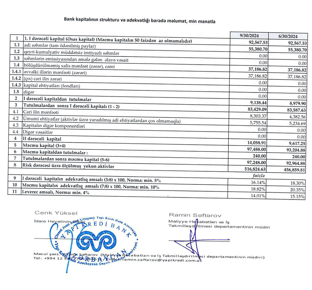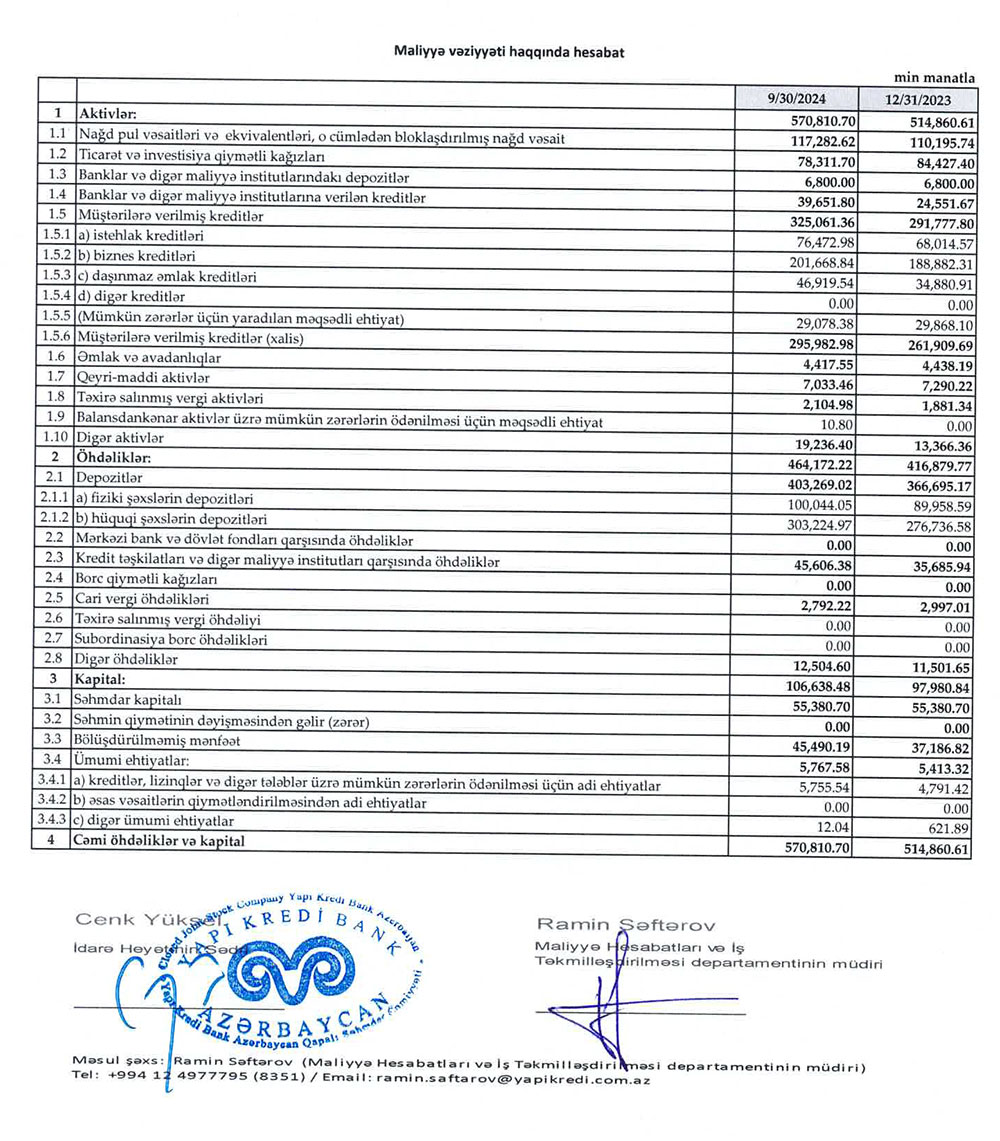 2023-cü ilin sonu ilə müqayisədə 2024-cü ilin 9 ayı ərzində "Yapı Kredi Bank Azərbaycan"da depozitlər 36 milyon 574 min manat və ya 9% artaraq 403 milyon 269 min manata yüksəlib.