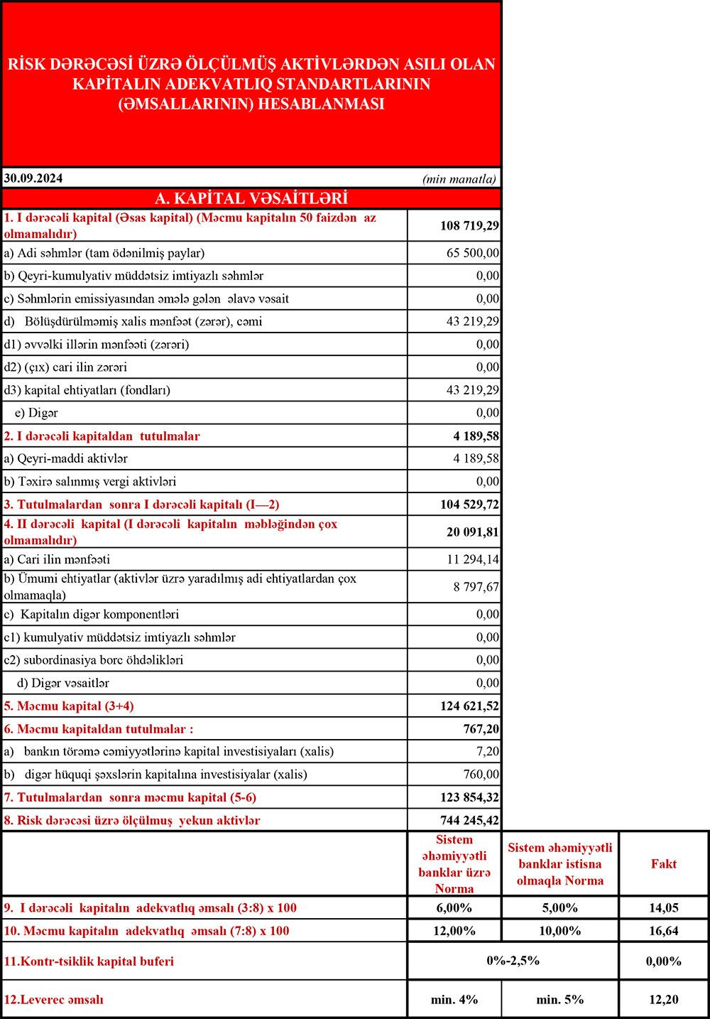 2023-cü ilin sonu ilə müqayisədə 2024-cü ilin 9 ayı ərzində "Ziraat Bank Azərbaycan"ın kredit portfeli (müştərilərə verilən kreditlər) 53 milyon 536 min manat və ya 13,7% artaraq 444 milyon 478 min manata çatıb. Bankın cəmi aktivləri isə 168 milyon 272 min manat və ya 26,4% artaraq 804 milyon 9567 min manata yüksəlib.