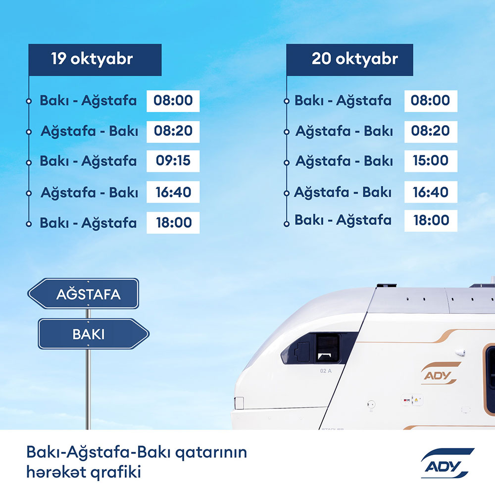 ADY sərnişin tələbatını təmin etmək məqsədilə 19 və 20 oktyabr tarixlərində Bakı-Ağstafa-Bakı marşrutu üzrə əlavə qatar reysləri təyin edir.