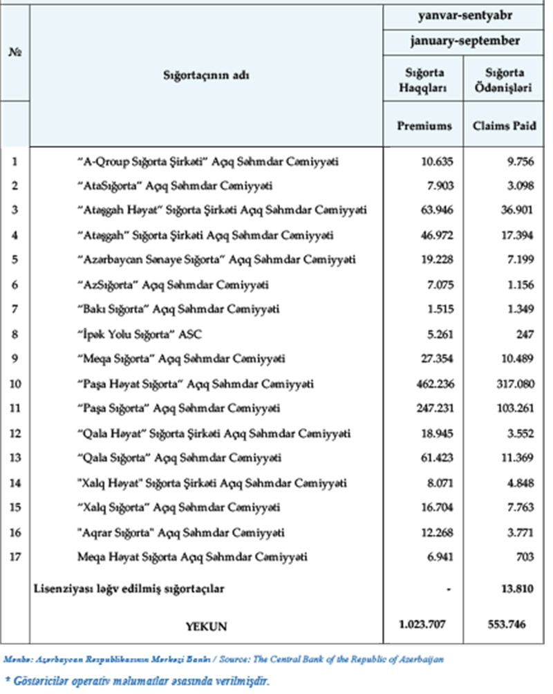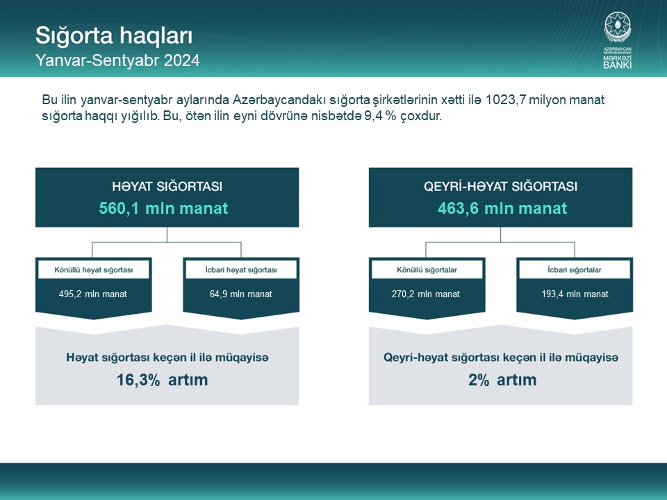 Cari ilin yanvar-sentyabr aylarında həyat sığortası üzrə 560,1 milyon manat, qeyri-həyat sığortası üzrə 463,6 milyon manat sığorta haqları hesablanıb. Ötən ilin müvafiq dövrü ilə müqayisədə yığım həyat sığortası üzrə 16,3%, qeyri-həyat sığortası üzrə 2% artıb.
