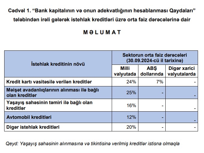 Məlumata görə, 30 sentyabr 2023-cü il tarixi ilə müqayisədə 30 sentyabr 2024-cü il tarixində orta faiz dərəcəsi kredit kartı vasitəsilə verilən kreditlər üzrə 1 faiz bəndi azalaraq 24%, avtomobil kreditləri üzrə 1 faiz bəndi azalaraq 12%, yaşayış sahəsinin təmiri ilə bağlı olan kreditlər üzrə 3 faiz bəndi azalaraq 16% təşkil edib.