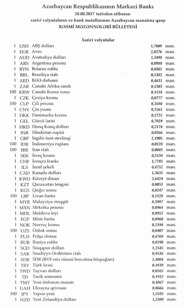 Avqustun 28-nə Mərkəzi Bankın açıqladığı rəsmi Dollar/manat məzənnəsi Avqustun 25-i ilə müqayisədə dəyişməyərək 1,7009 manat olub, Avro/manat məzənnəsi isə 2.0276 manata qalxıb.