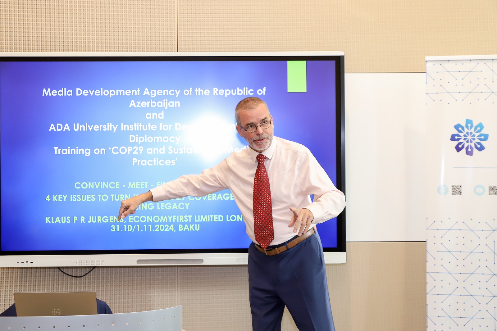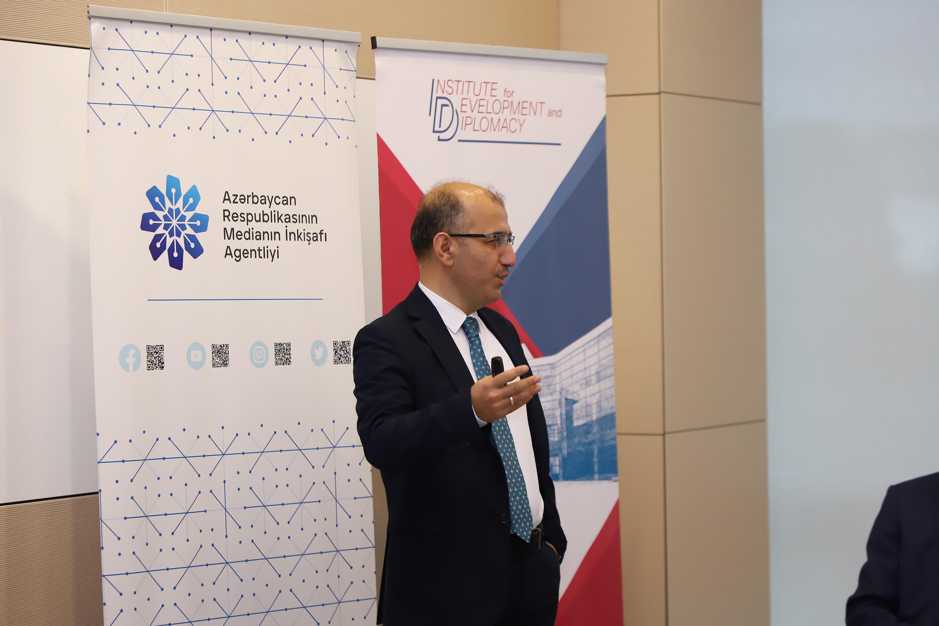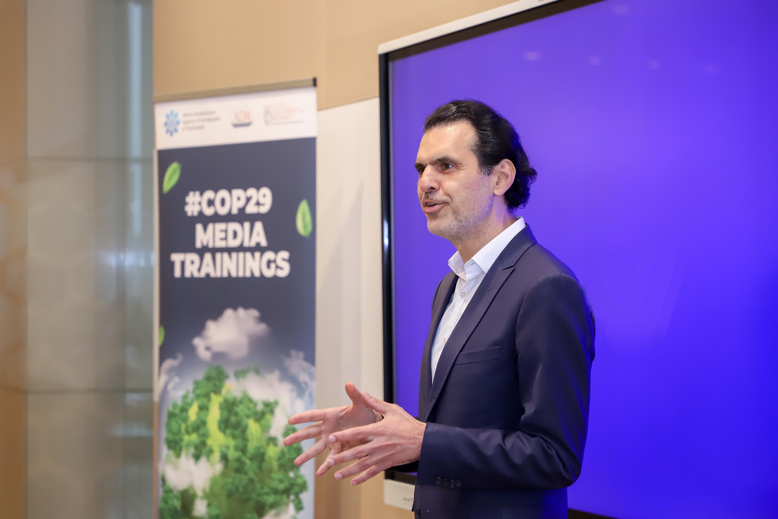 COP29-un işıqlandırılmasında aktiv iştirak edəcək ingilisdilli jurnalistlər üçün təşkil edilən silsilə təlimlər çərçivəsində Medianın İnkişafı Agentliyi və ADA Universiteti İnkişaf və Diplomatiya İnstitutunun birgə təşkilatçılığı ilə “COP29 və Dayanıqlı Media Təcrübələri” mövzusunda növbəti təlimlərə başlanılıb.