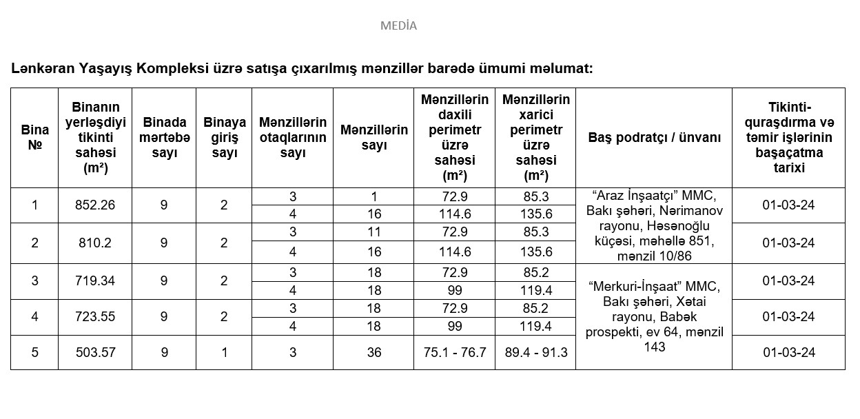 Satışa çıxarılan mənzillər barədə ümumi məlumat: