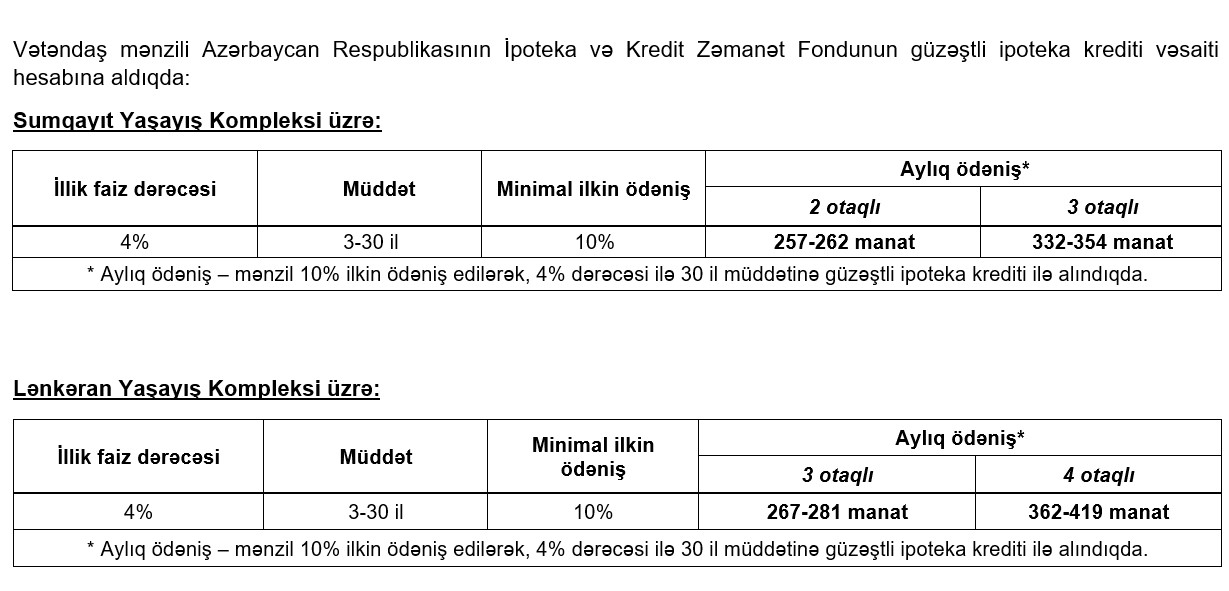 Mənzil İpoteka və Kredit Zəmanət Fondunun güzəştli ipoteka krediti vəsaiti hesabına aldıqda, illik faiz dərəcəsi 4%, müddət 30 ilədək, minimal ilkin ödəniş 10 faizdir. Sumqayıt Yaşayış Kompleksi üzrə aylıq ödəniş 2 otaqlı mənzil üçün 257-262 manat, 3 otaqlı mənzil üçün 332-354 manat, Lənkəran Yaşayış Kompleksi üzrə aylıq ödəniş 3 otaqlı mənzil üçün 267-281 manat, 4 otaqlı mənzil üçün 362-419 manatdır.