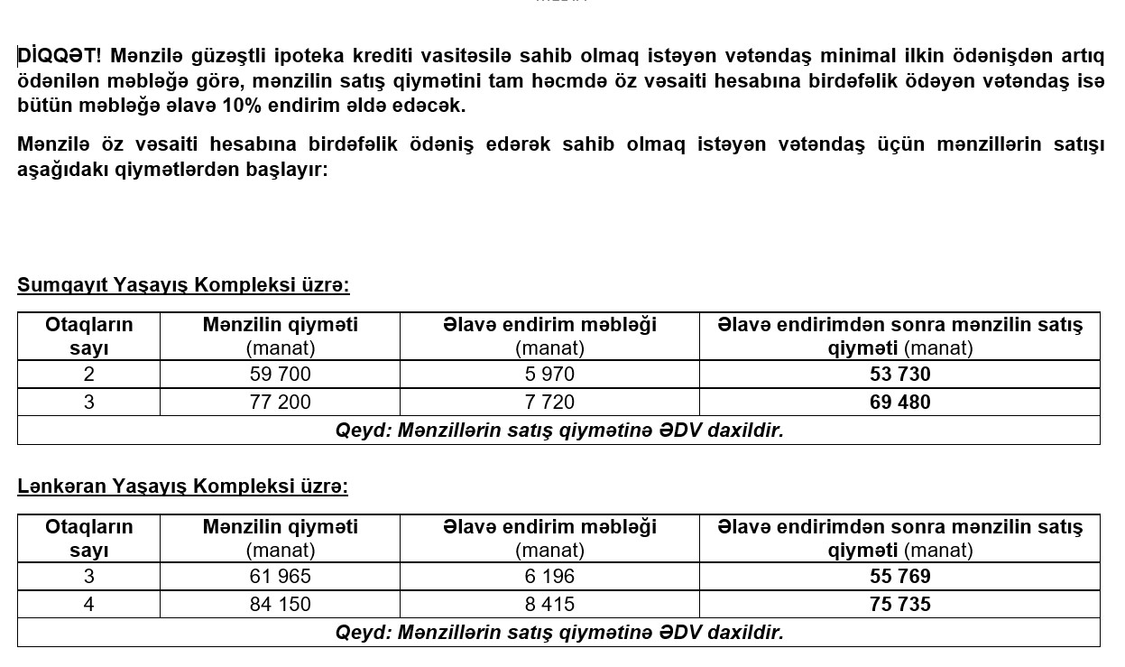 Qeyd: Mənzillərin satış qiymətinə ƏDV daxildir.
