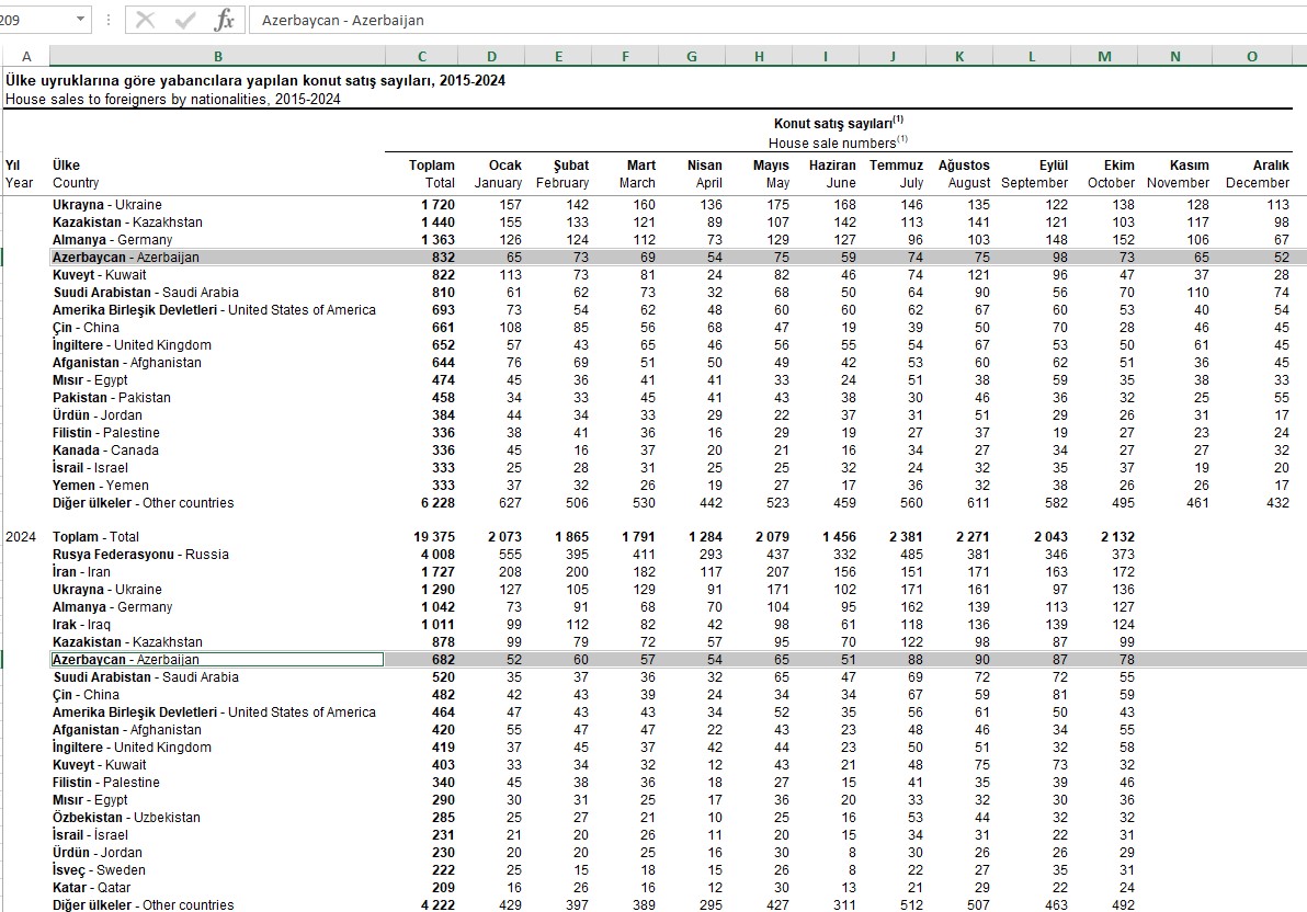 2024-cü ilin Oktyabr ayında Azərbaycan vətəndaşları Türkiyədə 78 ev alıblar (2023-cü ilin oktyabr ayında 73 mənzil almışdılar).