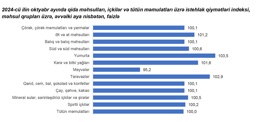 2024-cü ilin oktyabr ayında qida məhsulları, içkilər və tütün məmulatları üzrə istehlak qiymətləri indeksi əvvəlki aya nisbətən 0,5 faiz, yanvar-oktyabr aylarında isə əvvəlki ilin müvafiq dövrünə nisbətən 0,6 faiz artıb.