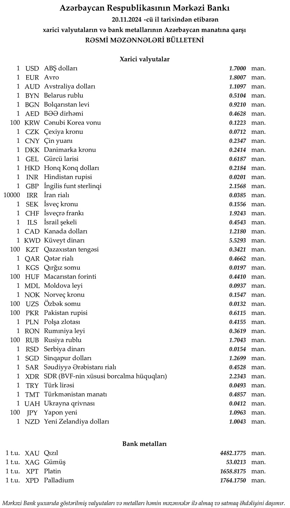 Dolların bazar ertəsi üçün rəsmi məzənnəsi müəyyən olunub