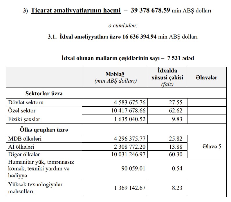 Müqayisə üçün qeyd edək ki, 2023-cü ilin 10 ayı ərzində Azərbaycanın xarici ticarət əməliyyatlarının həcmi43 milyard 520 milyon 185 min ABŞ dolları, o cümlədən, ixrac 29 milyard 345 milyon 994 min ABŞ dolları, idxal 14 milyard 174 milyon 191 min ABŞ dolları, saldo müsbət 15 milyard 171 milyon 804 min ABŞ dolları təşkil etmişdi.
