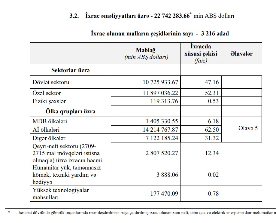 O cümlədən, ixrac 22 milyard 742 milyon 284 min ABŞ dolları, idxal 16 milyard 636 milyon 395 min ABŞ dolları, saldo müsbət 6 milyard 105 milyon 889 min ABŞ dolları olub.