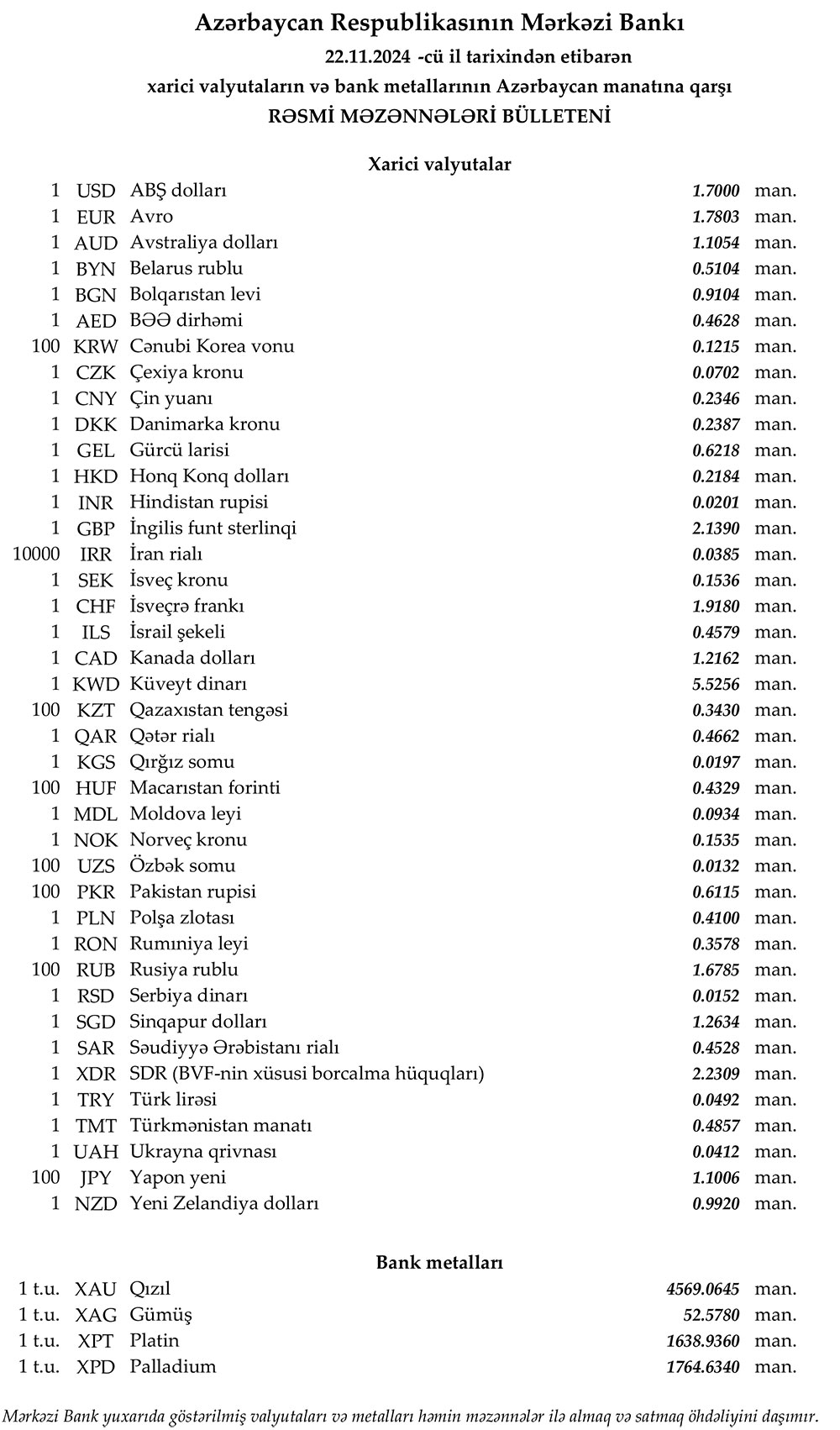 Dolların bazar ertəsi üçün rəsmi məzənnəsi müəyyən olunub
