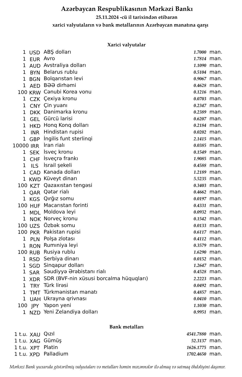 Dolların bazar ertəsi üçün rəsmi məzənnəsi müəyyən olunub