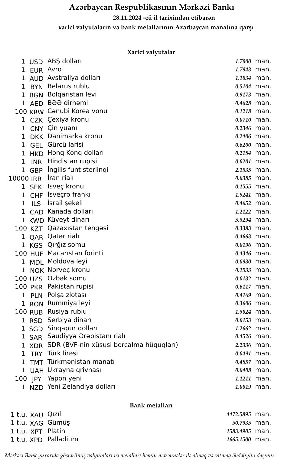 AZN Məzənnəsi. 28.11.2024 tarixindən etibarən