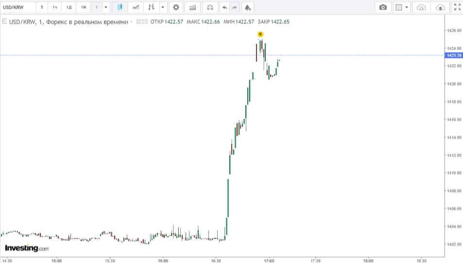 Marja.az xəbər verir ki, beynəlxalq Forex bazarında USD//KRW məzənnəsi Bakı vaxtı ilə saat 18:11-də 1,37% artaraq 1423,2 von təşkil edib. Sonuncu dəfə məzənnə bu səviyyədə 4 noyabr 2022-ci ildə olub.