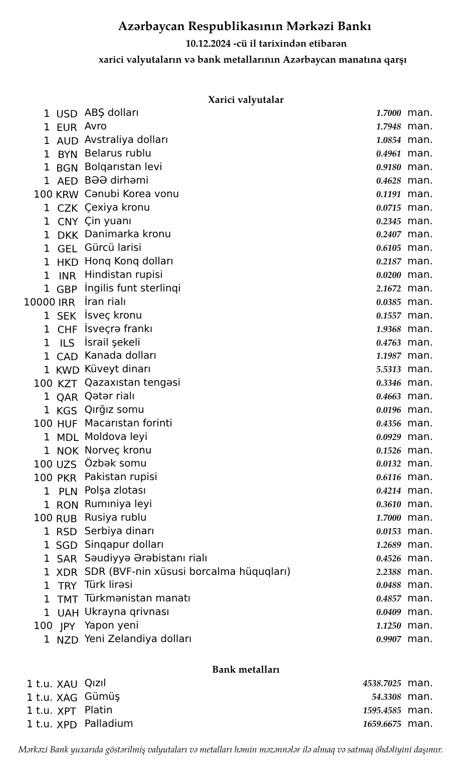 Dolların bazar ertəsi üçün rəsmi məzənnəsi müəyyən olunub