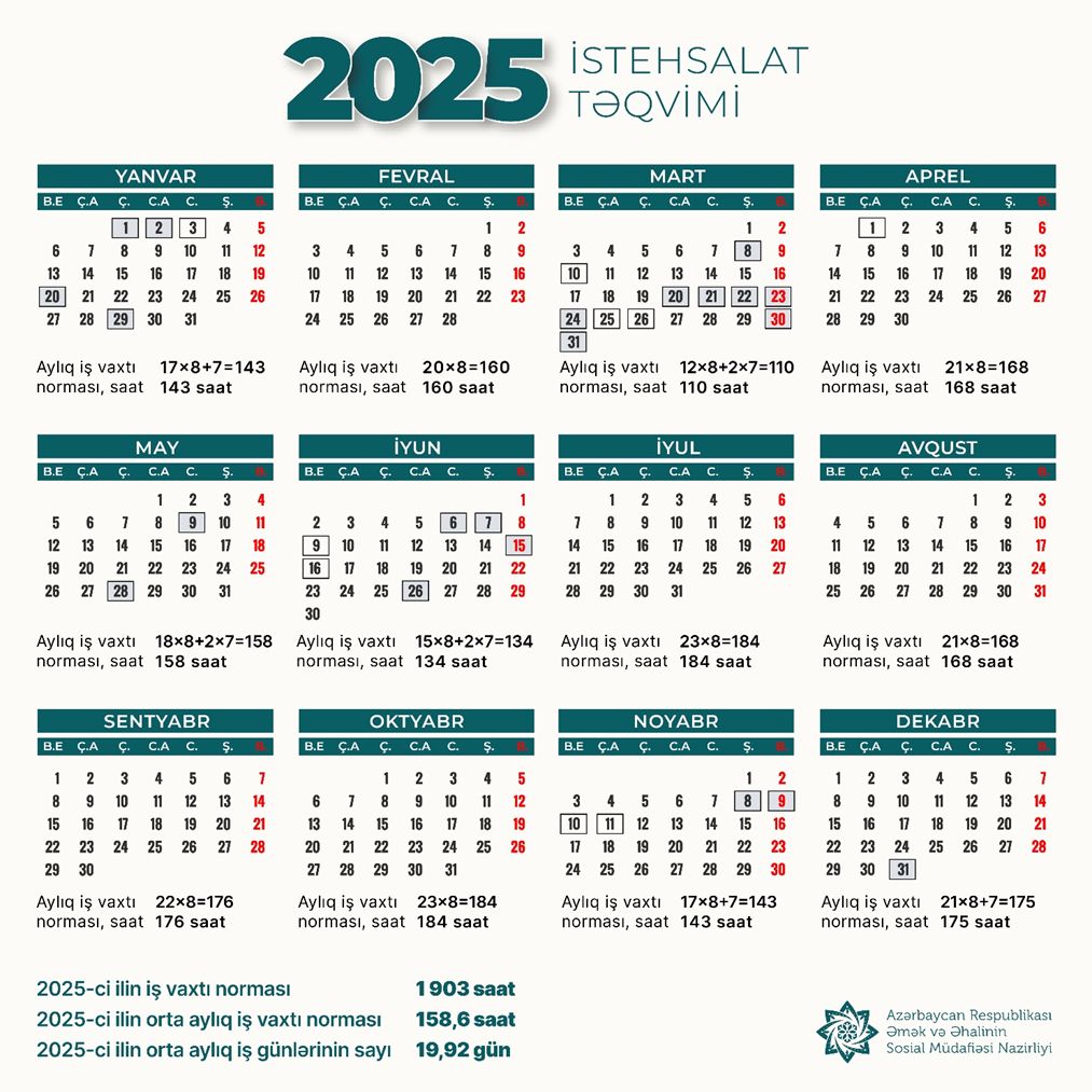 2025-ci ildə 5 günlük iş həftəsində 239 iş günü, iş günü hesab edilməyən 105 istirahət günü, iş günü hesab edilməyən 19 bayram, 1 Bələdiyyə seçkiləri günü və 1 Ümumxalq Hüzn Günü vardır. Qısası, 2025-ci ildə 126 gün qeyri-iş günüdür.Azərbaycan Respublikası Əmək və Əhalinin Sosial Müdafiəsi Nazirliyi Kollegiyası" 2025-ci il üçün iş vaxtı normasının və istehsalat təqviminin təsdiq edilməsi haqqında" qərar qəbul edib.