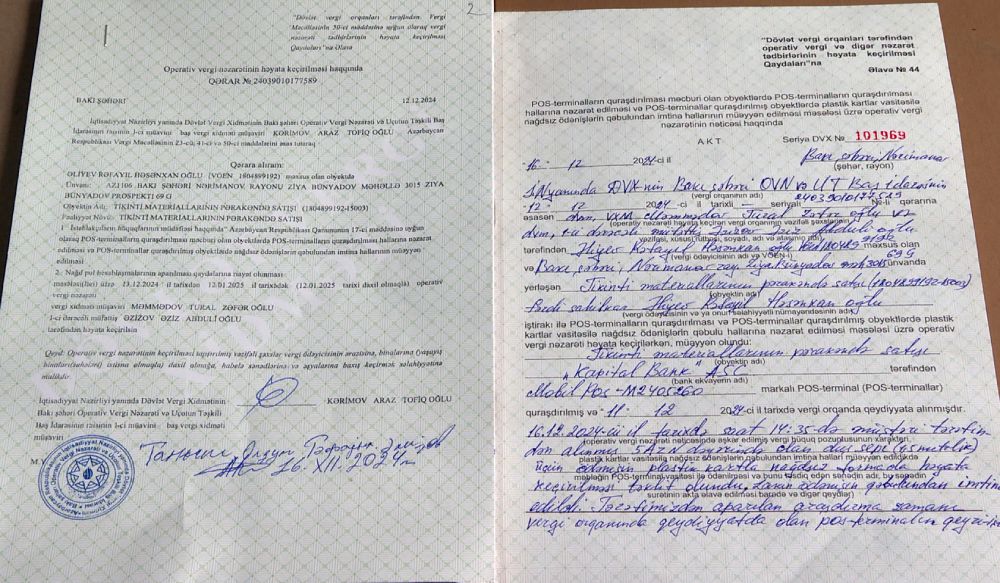 İqtisadiyyat Nazirliyi yanında Dövlət Vergi Xidməti POS-terminal quraşdırılması məcburi olan ticarət və iaşə obyektlərində POS-terminalların quraşdırılmaması və nağdsız ödənişlərin qəbulundan imtina hallarının qarşısının alınması məqsədilə vergi nəzarəti tədbirlərini davam etdirir.