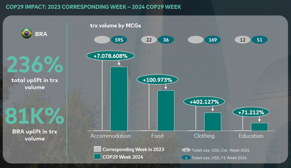 “Mastercard Advisors” biznes konsultasiya xidməti tərəfindən hazırlanan və Mastercard-ın satış nöqtələri üzrə (POS) xərc məlumatlarına əsaslanan hesabatda COP29-un Azərbaycan iqtisadiyyatına təsiri ilə bağlı əsas göstəricilər bu qlobal tədbir sayəsində əldə edilmiş böyük iqtisadi irəliləyişi nümayiş etdirir.