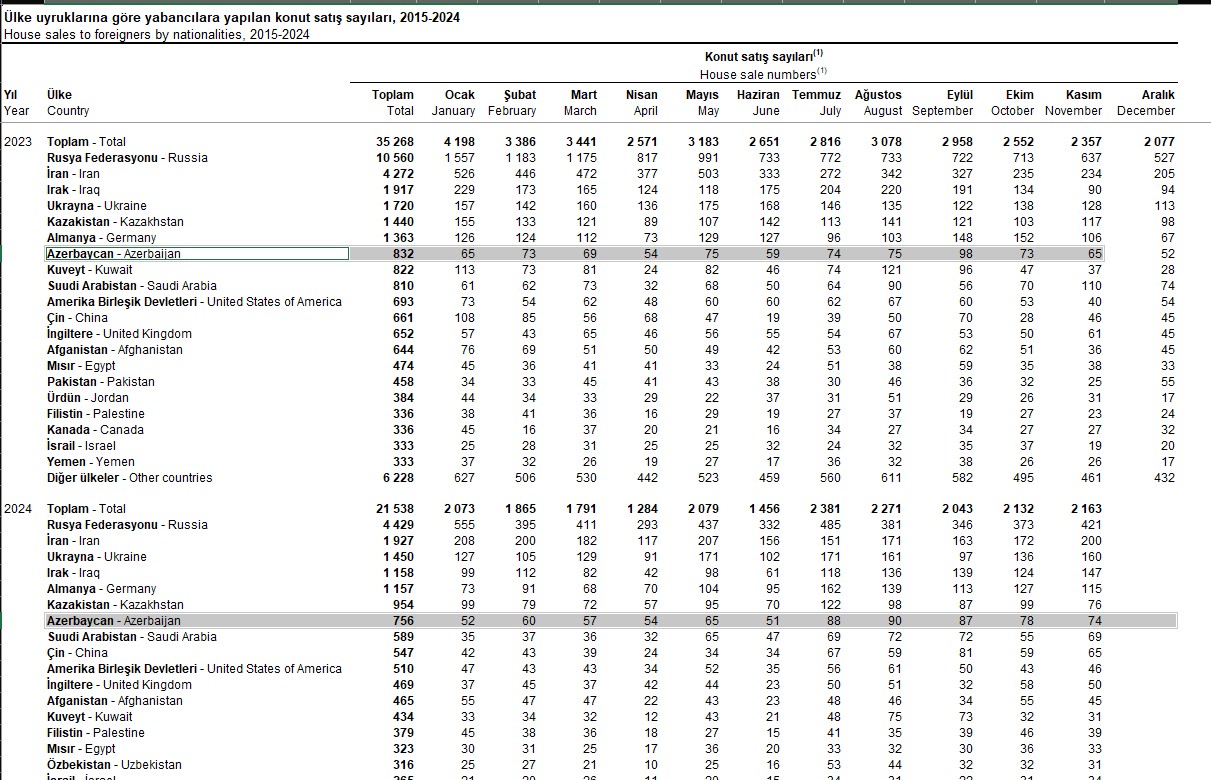 2024-cü ilin Noyabr ayında Azərbaycan vətəndaşları Türkiyədə 74 ev alıblar (2023-cü ilin oktyabr ayında 65 mənzil almışdılar).