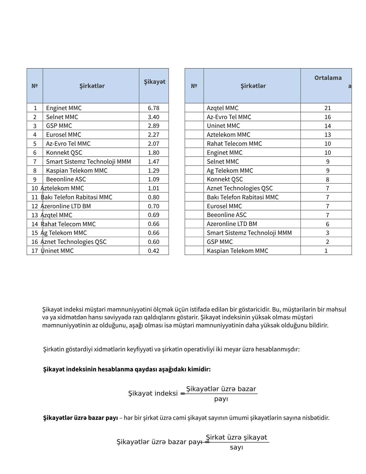 Beynəlxalq metodologiyaya uyğun olaraq, şikayət indeksi və şikayətlərin ortalama cavablandırılma müddəti telekommunikasiya operator və provayderlərinə daxil olan şikayətlər üzrə bazar payının onların abunəçilər üzrə bazar payına olan nisbəti kimi hesablanır.