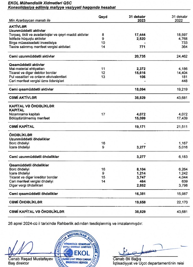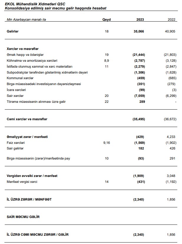 “Ekol Mühəndislik Xidmətləri” QSC 2023-cü ili 2 milyon 340 min manat xalis zərər ilə başa vurub. Şirkət 2022-ci ili 1 miylon 856 min manat xalis mənfəət ilə bağlamışdı. Ötən il şirkətin satışı azalıb.