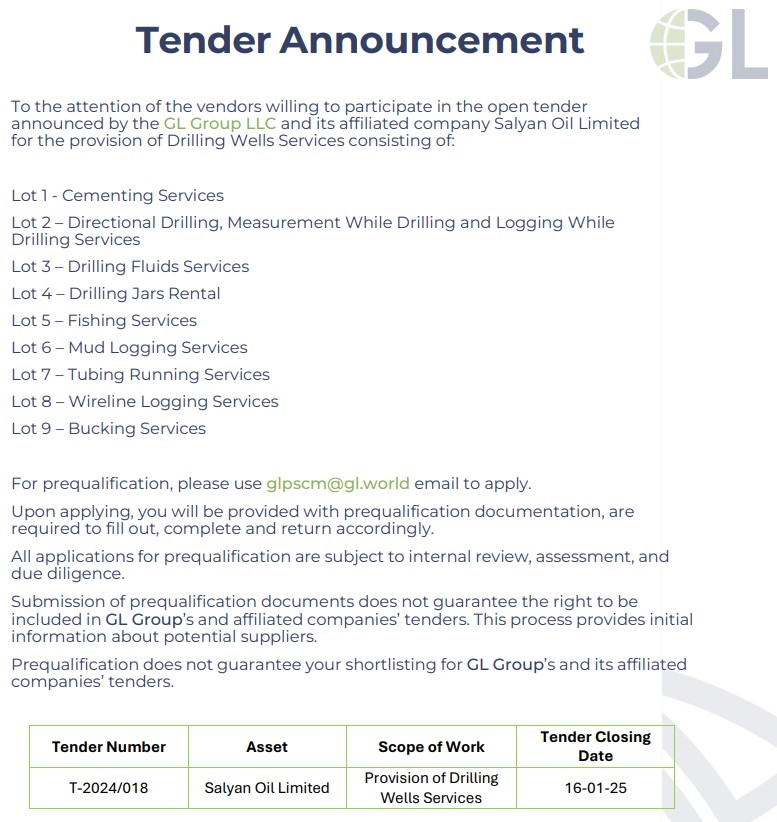 (®) "GL Group" MMC-yə məxsus "Salyan Oil Limited" şirkəti tərəfindən "Qazma Üzrə Quyu Xidmətlərinin göstərilməsi" üçün tender elan edilib. Tenderin son tarixi 16 Yanvar 2025-ci ildir.
