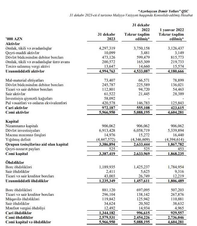 Marja.az QSC-nin 31 dekabr 2023-cü il tarixində tamamlanan il üzrə konsolidə edilmiş maliyyə hesabatlarına istinadən xəbər verir ki, 31 dekabr 2023-cü il tarixində "Azərbaycan Dəmir Yolları" 5 milyard 966 milyon 950 min manat cəmi aktivlərə malik olub. 2022-ci ilin sonu ilə müqayisədə 2023-cü ildə "Azərbaycan Dəmir Yolları"nın cəmi aktivləri 878 milyon 755 min manat və ya 17,3% artıb. Cəmi aktivlərdəki artım əsasən "Əmlak, tikili və avadanlıqlar", "Pul vəsaitləri və onların ekvivalentləri" və "İnvestisiya qiymətli kağızları" üzrə artımlardan qaynaqlanıb. Ötən il QSC qiymətli kağızlara 58 milyon 92 min manat investisiya edib.