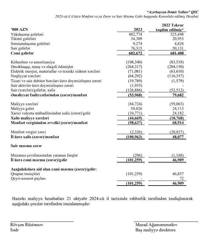 "Azərbaycan Dəmir Yolları"nın 2023-cü ildə 653 milyon 498 min manat cəmi gəlirlərinə qarşı cəmi xərcləri 754 milyon 461 min manat təşkil edib. Yaranmış 100 milyon 963 min manatlıq fərq şirkətin böyük məbləğdə kapitalı hesabına bağlanılıb. Ötən il ADY-nin cəmi xərclərinin artması əsasən əməkhaqqı, enerji, material, köhnəlmə və amortizasiya, debitor borcların dəyərsizləşməsi və sair xərclərdəki artımlardan qaynaqlanır.