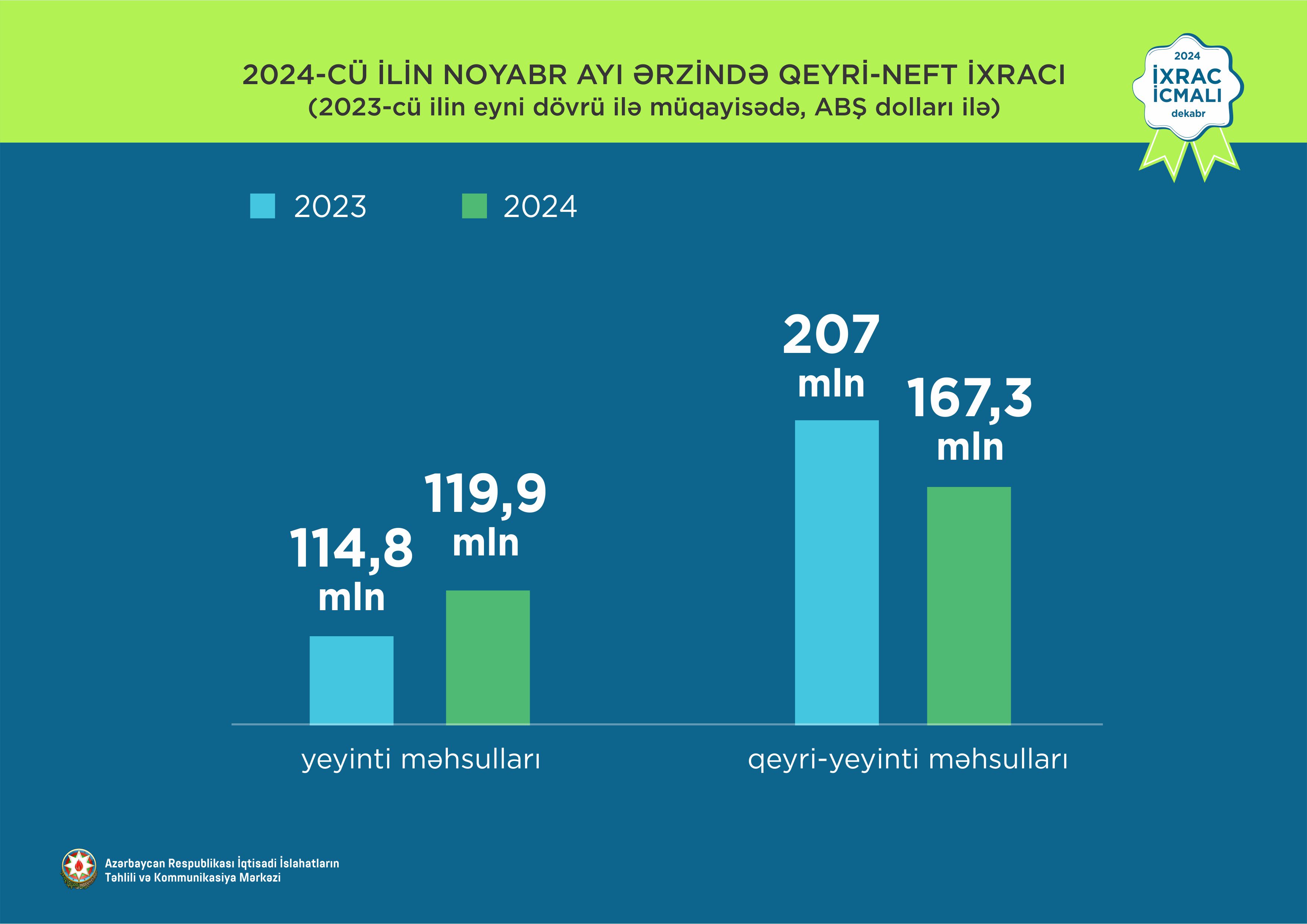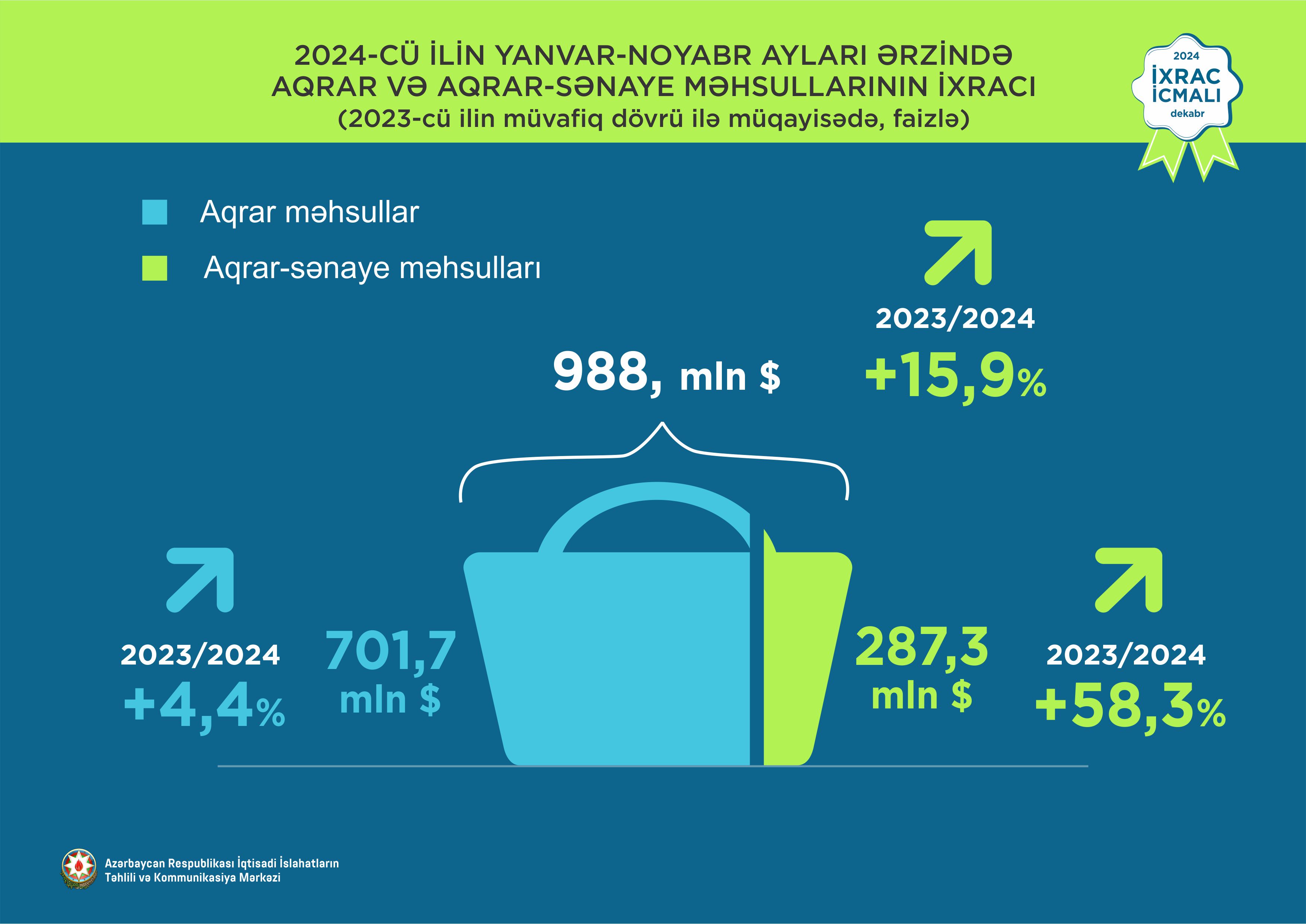 2024-cü ilin yanvar-noyabr ayları ərzində aqrar məhsulların ixracı 4,4% artaraq 701,7 milyon ABŞ dolları, aqrar-sənaye məhsullarının ixracı 58,3% artaraq 287,3 milyon ABŞ dollarına bərabər olub. Bütövlükdə aqrar və aqrar-sənaye məhsullarının birgə ixracı 15,9% artaraq 988,9 milyon ABŞ dolları təşkil edib.