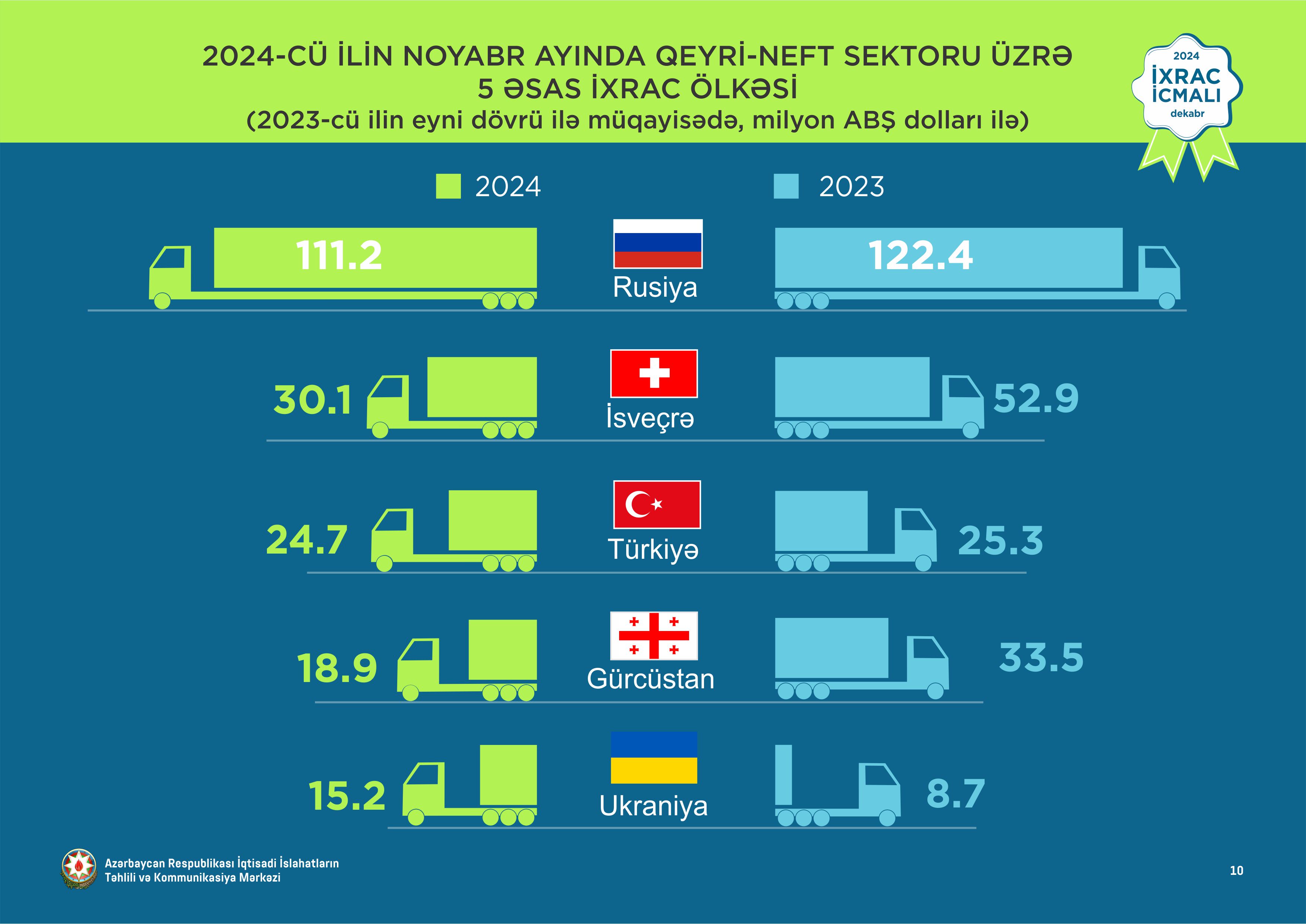 Cari ilin noyabr ayında qeyri-neft sektoruna aid ən çox mal ixrac edilən ölkələrin siyahısında Rusiya Federasiyası (111,2 milyon ABŞ dolları) birinciliyə yüksəlib. Bu siyahıda Türkiyə (30,1 milyon ABŞ dolları) ikinci, İsveçrə (24,7 milyon ABŞ dolları) üçüncü olub.