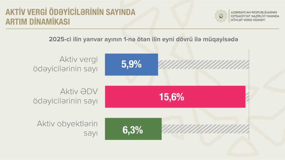 1 yanvar 2025-ci il tarixinə aktiv vergi ödəyicilərinin sayı 5,9 faiz artaraq 806,9 min, aktiv ƏDV ödəyicilərinin sayı isə 15,6 faiz artaraq 52,8 min təşkil edib.