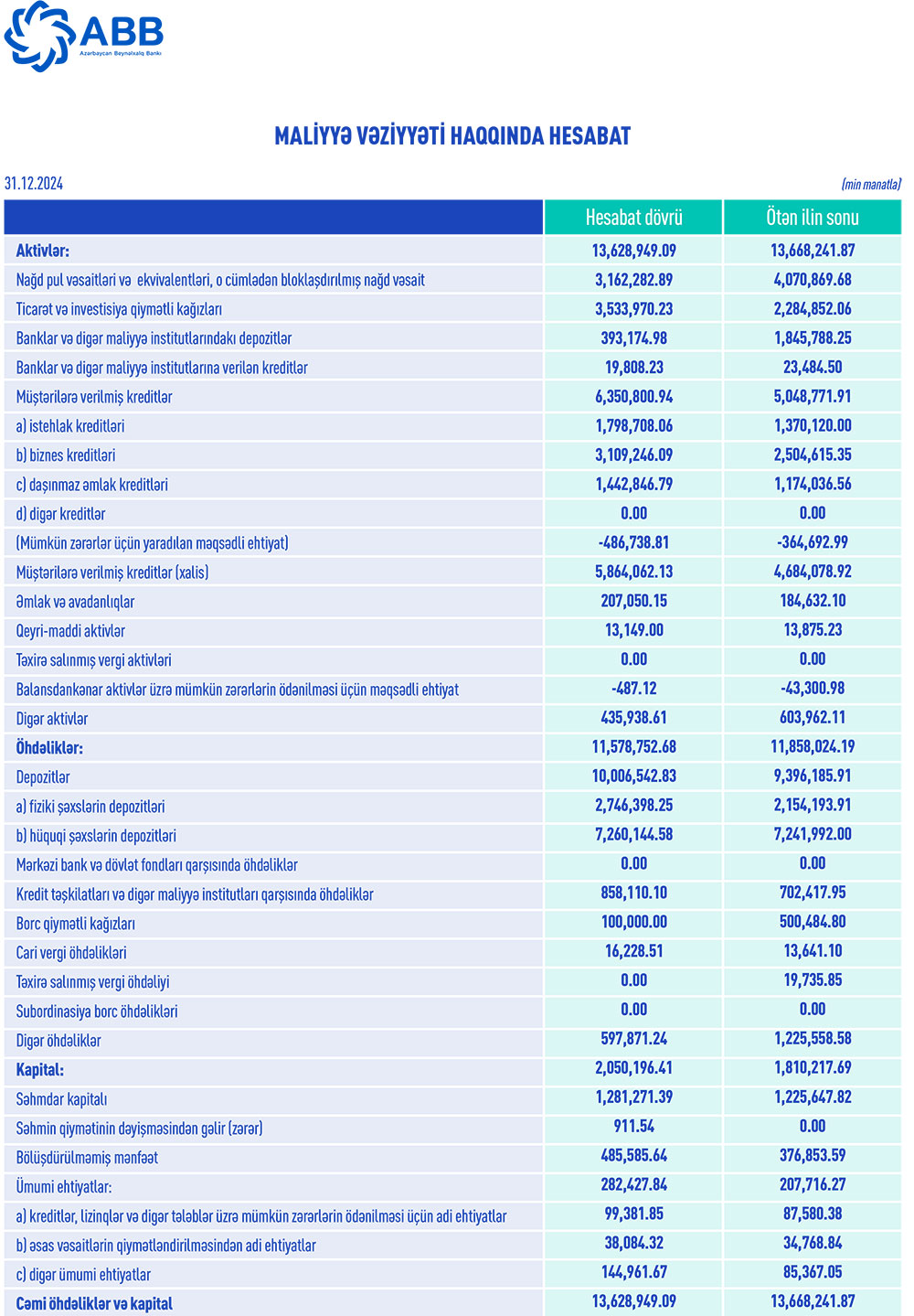 31 dekabr 2024-cü il tarixində ABB 1 milyard 743 milyon 760 min manat məcmu kapitala malik olub.