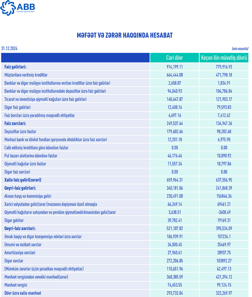 ABB 2024-cü ildəki 479 milyon 037 min manatlıq əməliyyat mənfəətindən 110 milyon 651 min manat “Mümkün zərərlər üçün yaradılan məqsədli ehtiyatlar” üzrə ayırıb. Bank 368 milyon 386 min manat vergidənöncəki mənfəətindən 74 milyon 653 min manat mənfəət vergisi hesablayıb və ötən ili 293 milyon 732 min manat xalis mənfəətlə başa vurub.