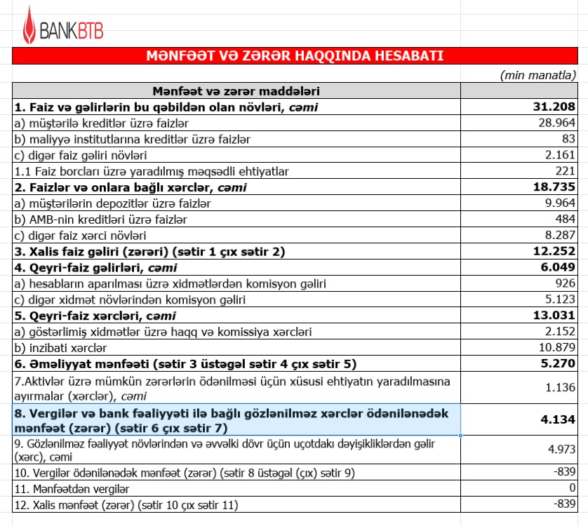 Ötən il "Bank BTB" 5 milyon 270 min manat əməliyyat mənfəətindən 1 milyon 135 min manat aktivlər üzrə mümkün zərərlərin ödənilməsi üçün xüsusi ehtiyatın yaradılmasına ayırıb. Həmçinin bankın 4 milyon 973 min manat gözlənilməz fəaliyyət növlərindən və əvvəlki dövr üçün uçotdakı dəyişikliklər üzrə xərci olub. Nəticədə "Bank BTB"nin 839 min manatlıq mənfi göstəricisi yaranıb. Qeyd edək ki, mənfi göstərici 2023-cü ildə 2 milyon 779 min manat idi. Ötən il bu göstəricinin 3,3 dəfə azalması diqqəti cəlb edir.