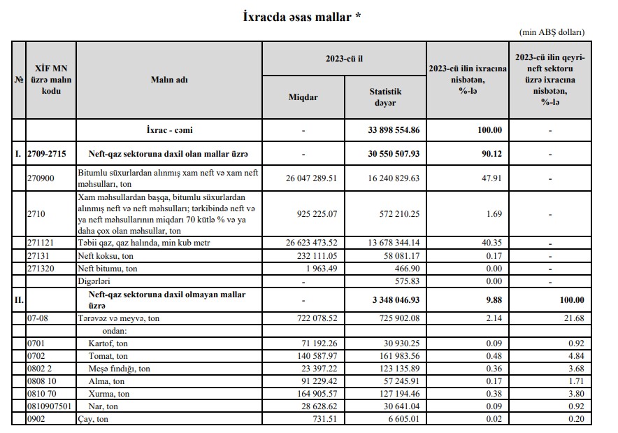 7,4 MİLYARD DOLLARLIQ AZALMA2024-cü ildə Azərbaycandan neft-qaz sektoruna daxil olan mallar üzrə ixracın cəmi dəyəri 23 milyard 197 milyon 549 min dollar təşkil edib. Bu, 2023-cü ilə nisbətən 7 milyard 352 milyon 958 min dollar və ya 24% azdır. 2023-cü ildə Azərbaycandan neft-qaz sektoruna daxil olan mallar üzrə ixracın cəmi dəyəri 30 milyard 550 milyon 507 min dollar təşkil etmişdi.